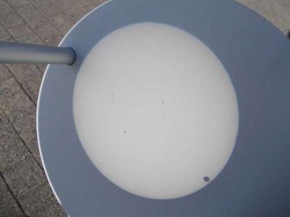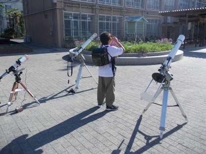 6月6日,金星の日面通過がありました。特にきれいというわけではありませんが,とても珍しい現象で,観測と計算によって現象を正確に予報できることが素晴らしいと思いました。朝休み・中間休み・昼休みに,児童に様子を見てもらえるように太陽投影板を装着した天体望遠鏡と,先日も使った日食グラスと日食シートを用意しました。