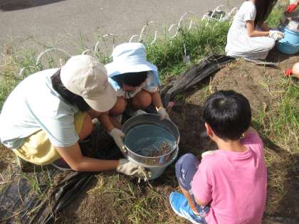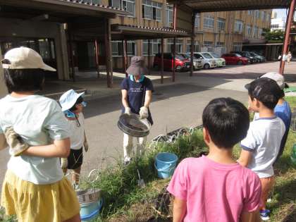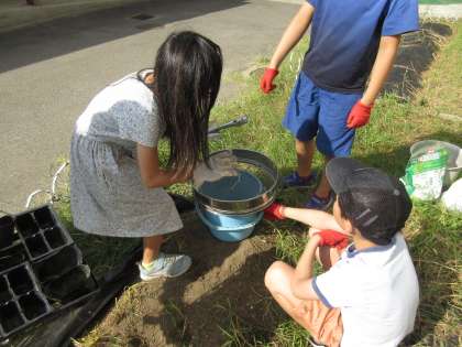 生単「畑のかんさつ」の学習では、新たに野菜を育てるために、野菜を育てる準備をしました。みんなで協力して生い茂っていた雑草を抜き、スコップやバケツ、ふるいを使って、石や大きな根、植物のゴミなどを取り除くなど元気な野菜が育つように、一生懸命、土づくりをする姿が見られました。