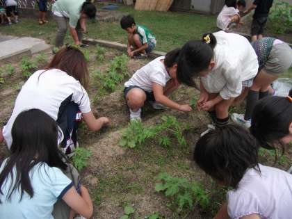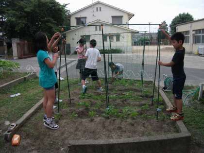 4年生が花壇に植えているツルレイシが大きくなって,支えがほしい…というぐらいに育ってきました。そこで,昼休みに4年生が雑草抜きをしました。6時間目に,委員会活動の5年生が,ネットを立ててくれました。