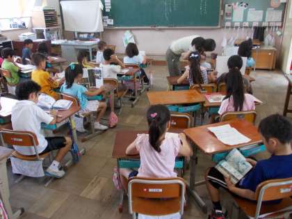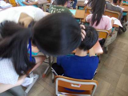 月曜日の朝学習は全校朝読書です。2年生の教室をのぞいてみると,子ども達が読書をしている時に,担任の先生が「頭じらみは大丈夫かな?」と,頭髪検査をしていました。プールの季節ならではの風景です。