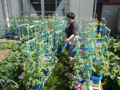 植木鉢で一人一鉢観察をしています。つるが伸びてきて,隣の鉢と絡まりそうになっています。すっかり大きくなりました。