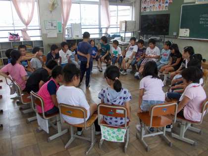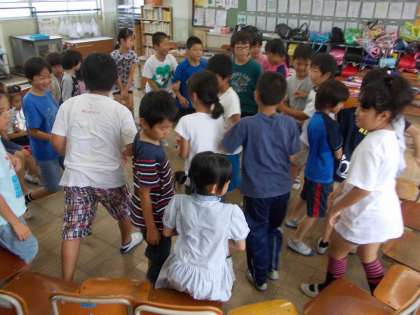 4年ろ組の教室は端にあるので,他教室と比べると廊下の分だけ広いのです。雨で運動場が使えない時など,机を端に寄せると広大な空間が得られます。今日は「何でもバスケット」を仲よくしていました。