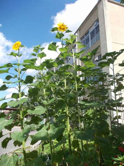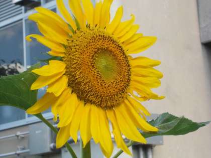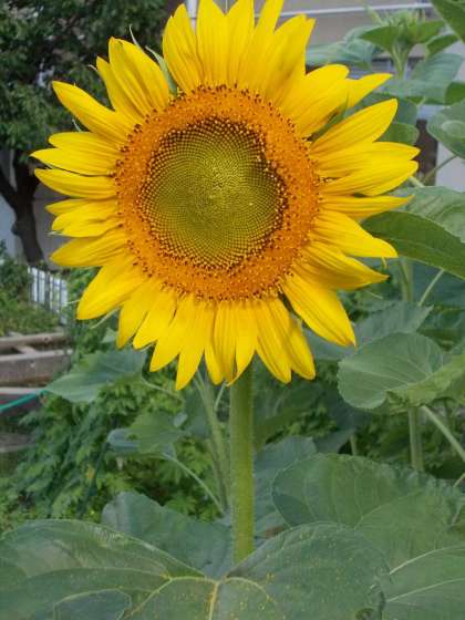 3年の学年園は東門のすぐ横にあります。大きく育ったヒマワリが花を咲かせました。よく見ると,ヒマワリの葉の上に花粉がこぼれている様子も観察できました。