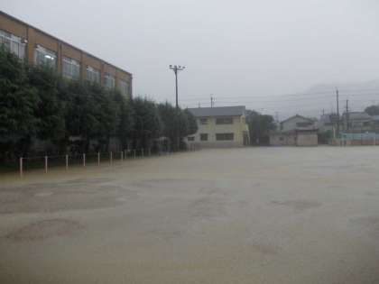 運動場の雨水も溝に吸い込まれるように流れていきます。道路を歩く時に,万一側溝が外れていると大変危険です。道路の端の側溝の所は,絶対歩かないようにしましょう。