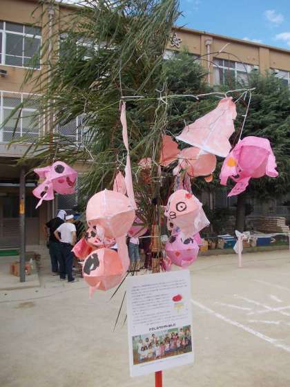 暑い中準備をしていただきました。恒例行事とあって,段取りよく準備が進みました。左の写真は午前中に有志の子どもたちが作ってくれた「金魚ねぶた」です。