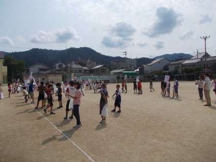秋の恒例行事『全校草引き』は,縦割りグループで実施します。班長がグループのカードを持って並んでいると,運動場に集合した学年からスムーズに児童が並んでいきました。