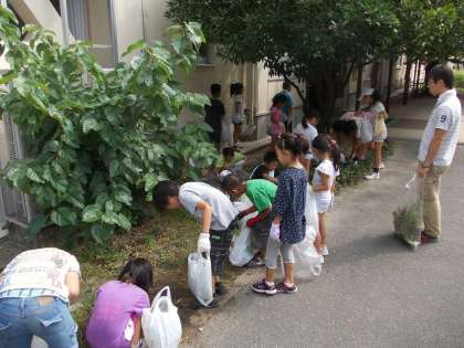 班で指定された場所を,縦割り班で協力して草引きをしました。高学年が低学年を優しく指導している姿があちらこちらで見られて嬉しく思いました。