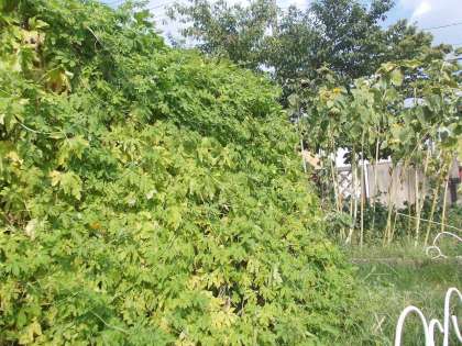 4年生のツルレイシも猛暑のおかげで青々とした葉を茂らせ,とっても元気です。夏の疲れには,ツルレイシの苦い味がいいのかもしれませんね。