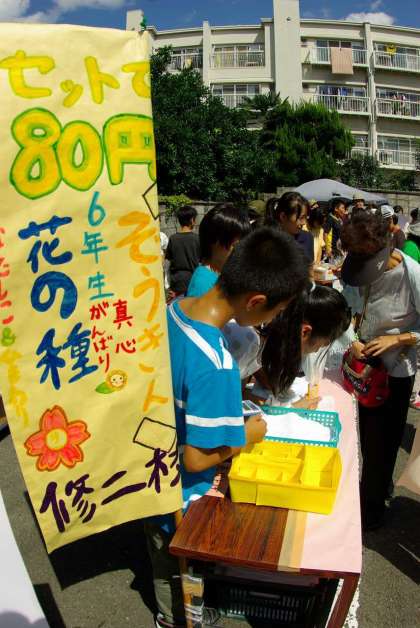 修二小6年生のお店は,手作りぞうきんと花壇のナデシコとヒマワリのタネをセットして売りました。6年児童は全員出席し,たくさん作った「ぞうきん」もすべて売り切ることができました。皆様のご協力に感謝しています。