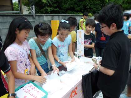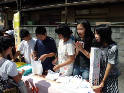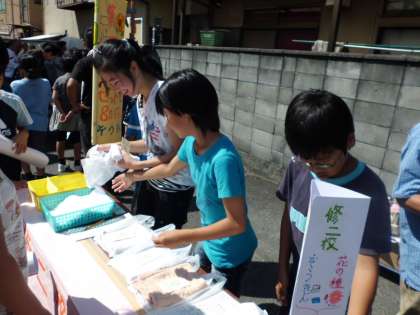 修二小学校のお店では,5〜6人の班が交代で,売ったりお客さんを集めたりしました。