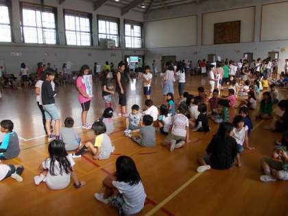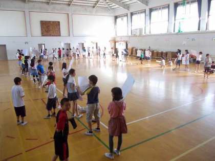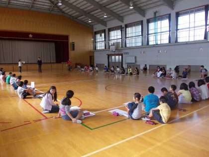 児童朝会は6年生のリーダーを先頭にして,縦割りグループで並んで集合します。いち早く6年生がライン上に並んで,下級生を迎え入れる態勢を作ってくれています。
