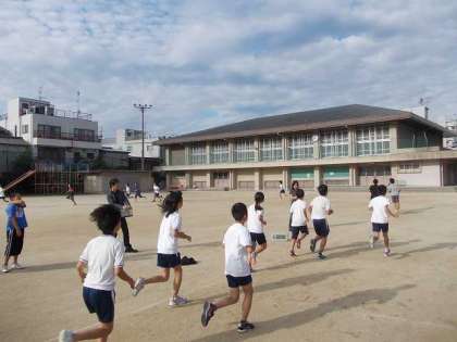 10月3日も朝マラソンが行われました。運動場のトラックを10周,1000m走です。体調を崩して走れない児童も,走っている友達を応援するために集まってくれています。