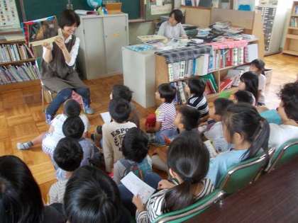 「昆虫たちの戦いが始まりました。さてどうなることやら…。」読み聞かせの予告放送を聞いてたくさんの子ども達が中間休みの図書室に集まりました。とても楽しいお話でした。