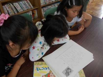 学級の図書係がクラスで紙芝居をするために,図書室で紙芝居を借りて仲よく下読みをしていました。これも中間休みのよい過ごし方の一つだと思いました。