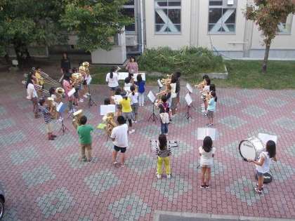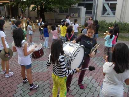 前期終業式が行われた日の放課後のドリームバンドの練習の様子です。区民体育祭に向けて楽器を下して,中庭で特訓しています。翌日の土曜日の午前中も練習しました。