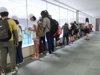続いて110番通信指令センターも見学させていただきました。こちらの方は,写真撮影禁止でしたので,子ども達が階下を覗きこんでいる様子だけ撮影しました。