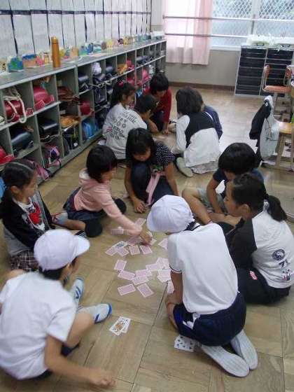 10月17日,中間休みに3回目の全校縦割り遊びがありました。前回と前々回に運動場と体育館で遊んだグループが,担当の先生の教室に集まりました。
