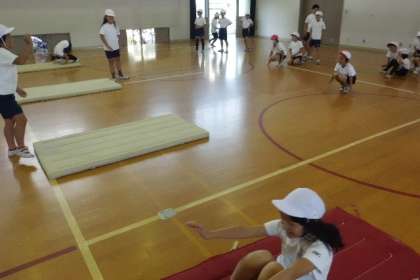 四年生は合同で体育をしました。ハードル走が終わり、今日からマット運動です。安全に気をつけて頑張りましょうね。