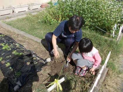 雑草と育てている野菜の幼苗の違いを教えてもらって,雑草抜きをしています。