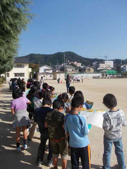 今日は半月です。2時の時点では快晴の絶好の観察日和。4年生全員は,運動場の鉄棒の所に並んで,半月の見える場所を観察用紙に記録しました。