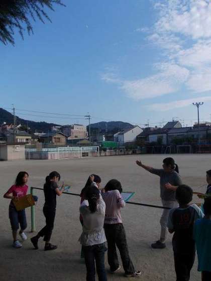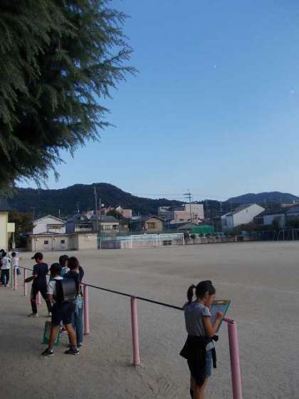 今日は半月です。3時半の時点で雲が少し広がってきました。6時間のクラブを終えた4年生は2時に観察した場所に戻ってきて,3時半の月の見える場所を観察用紙に記録しました。