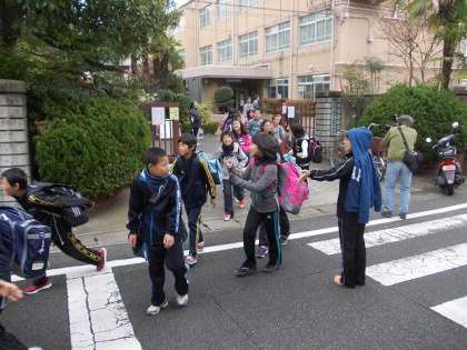 京都バスに乗るために校門を出発しました。時雨もおさまってくれました。