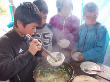 野外炊事豚汁・おいしい・5年生花脊山の家〜