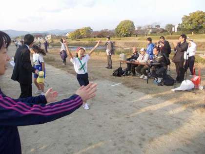 写真はスタートの様子と,優勝した修学院小学校のゴールと,本校のアンカーのゴールです。全13チームが無事完走しました。
