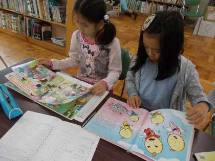 図書室で3年生が読書を楽しんでいます。みんなで絵本を囲んで,本当に楽しそうでした。読書の秋を満喫してほしいものです。