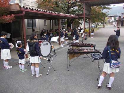 今日は児童館まつりと左京ふれあいカーニバルの2か所の依頼演奏があります。北校舎入口付近で音出しをしてから本番に臨みます。