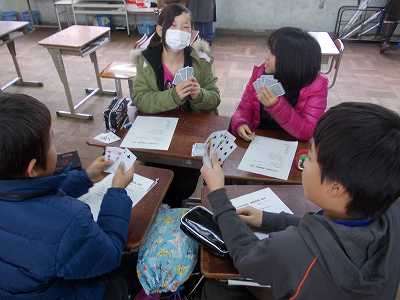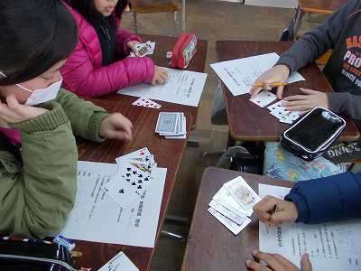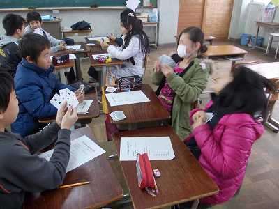 数学を選択した児童は,マイナスの意味を教えてもらって,トランプを使ってババ抜きの要領でカードを抜き合って得点を競いました。計算問題も,トランプを使ってみんなですると楽しそうでした。