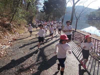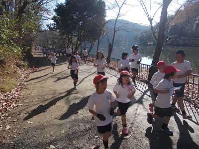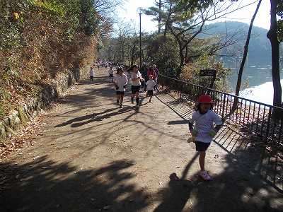 子ども達が走っている様子です。好天に恵まれて,たくさんの保護者の方々に見守られて走りました。