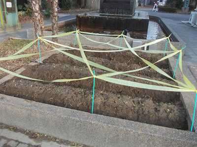 植えかえるのは本葉が出てからの方がよいのかもしれませんが,委員会の日に合わせて植えたのです。その後,タフロープで鳥よけも設置しました。うまく育ってくれることを願っています。