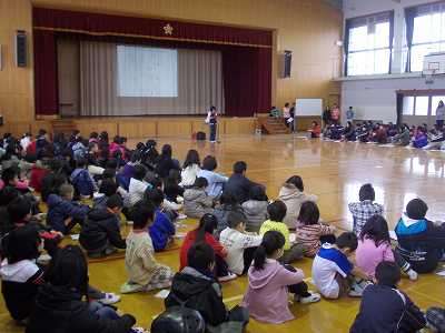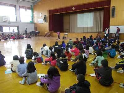 5年生は,山の家で学んだことをスピーチ発表しました。全校児童は,しっかり集中して静かに聞けました。