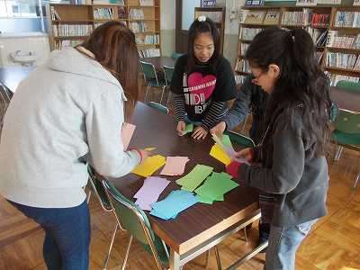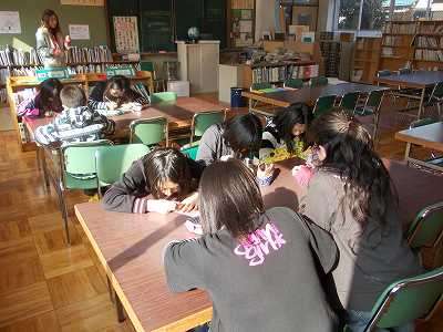 中間休みには高学年のしおり作りが行われていました。今日は天気が良かったので,来館者が少なかったのですが,慣れた手つきで『マイしおり』を作っていました。絵が完成すると,ラミネートして返してもらえます。
