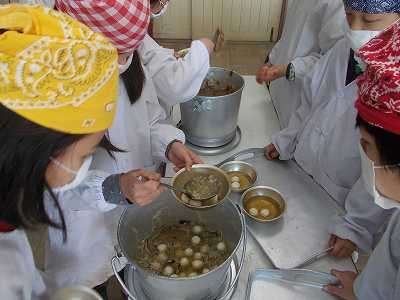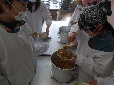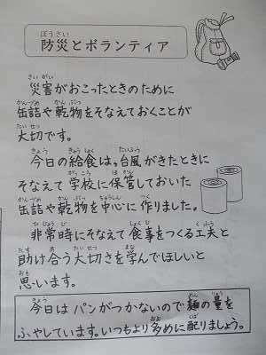 災害が起こるとライフラインが切断され,給食の食材も学校に届きません。そんな時に備えて,乾麺と乾物や缶詰を使っての献立です。給食カレンダーを見て,パンやごはんがつかない献立であることを知り,3年生の教室をのぞきにいってみました。