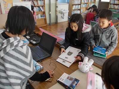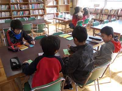 昼休みにも高学年のしおり作りが行われていました。通常の「貸出・返却」を終えた後,本を読む子に混じって慣れた手つきで『マイしおり』を作っていました。