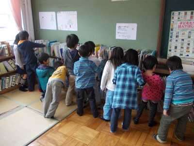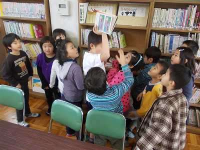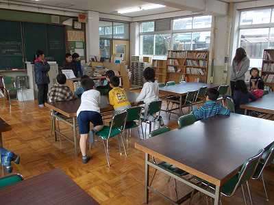 読書週間の取組として,中間休みに低学年対象の『本探しゲーム』がありました。図書委員会の人が指定する本を,席に着いた場所から一目散に探しに行きます。図書室の配架の学習にもなるとても楽しいゲームでした。