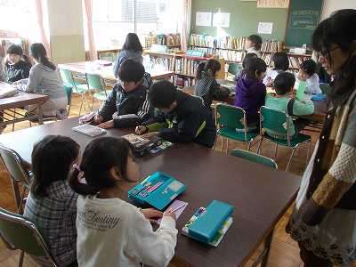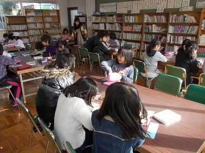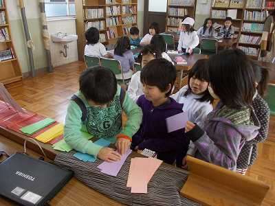 読書週間のお楽しみ『マイしおり作り』がありました。この日は低学年が対象でした。好きな色の画用紙を選び,裏面に学年・組・氏名を書いて,表に好きな絵を描きます。できあがったら,図書委員か担任の先生に渡すとラミネートをして,返してもらえます。