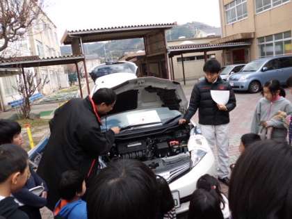 今回は「くるま」を題材にして,地球温暖化を防ぐために自分たちができることはどんなことか考えさせられる環境学習でした。エコドライブなどむだにCO2を出さない自動車の使い方や電気自動車の利用,また公共交通機関,自転車の利用,他には歩くことなど,できることはいろいろとあることが解りました。