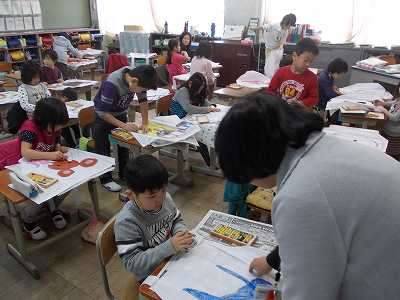 1年生は図工をしていました。たこに好きな絵を描いてきれいに色を塗っていました。