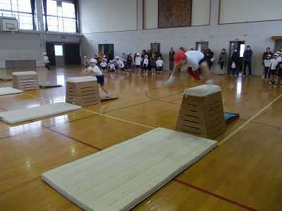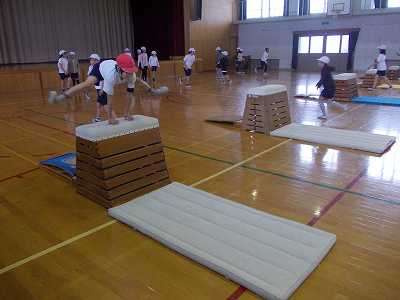4年生は体育をしていました。学年合同で,跳箱運動を見ていただきました。縦置き,横置きの違った高さの跳箱を用意して,自分の跳びやすい高さに挑戦しました。