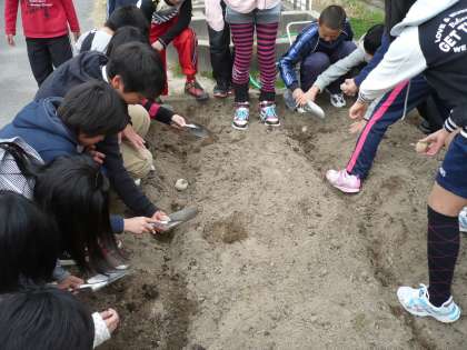 6年生での理科の学習で使うジャガイモを植えるため、掃除時間を使い、腐葉土を入れて畑を作りました。先日、その畑にジャガイモの種イモを植え付けました。これから世話をしていきます。大きく育ってくれることを願っています。