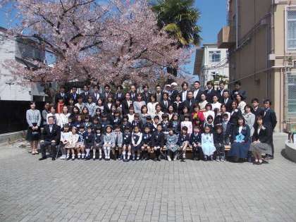 入学式を終えて,桜の木がある中庭で記念撮影をしました。その後,1年ろ組の教室に入って,担任の三木先生のお話を聞きました。教科書・ランドセルカバー等もいただきました。