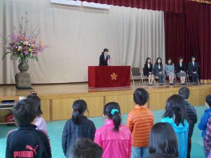 校長先生に紹介していただいた後,着任者を代表して田中先生からお話をしていただきました。6年生の児童がお迎えの言葉をしっかり言ってくれました。