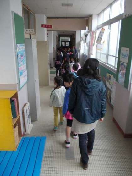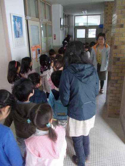 1年い組の子ども達が,担任の先生とまなびの先生に連れられて学校探検を始めました。職員室・保健室と,ロータリーを見学していました。