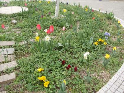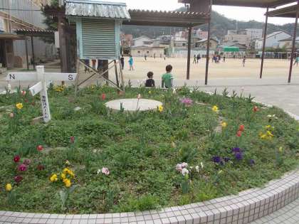 子ども達の憩いの場であるロータリーの花壇では,チューリップがきれいに咲いています。