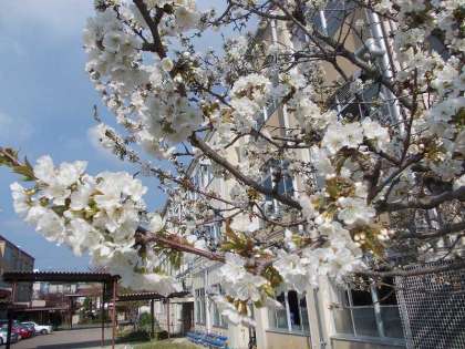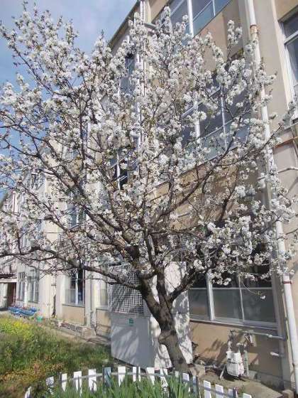 図書室前で満開を迎えるのがサクランボができる桜です。花の色が白っぽく,花のつき方も違います。