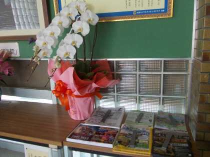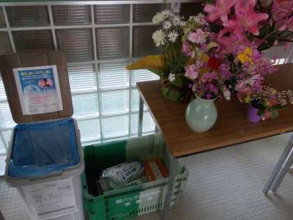 年度始めに玄関をきれいに掃除をしました。玄関には,回収ボックス(ペットボトルキャップ,牛乳パック,乾電池)と情報案内のチラシが置かれています。真ん中には,きれいな花があります。