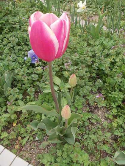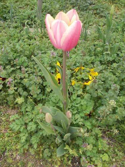 昨年度の1年生と園芸委員会が植えたチューリップの中には,一球で脇芽が何本も出てくる品種が混じっていたようです。兄弟のような,親子のような,珍しいチューリップが咲いています。